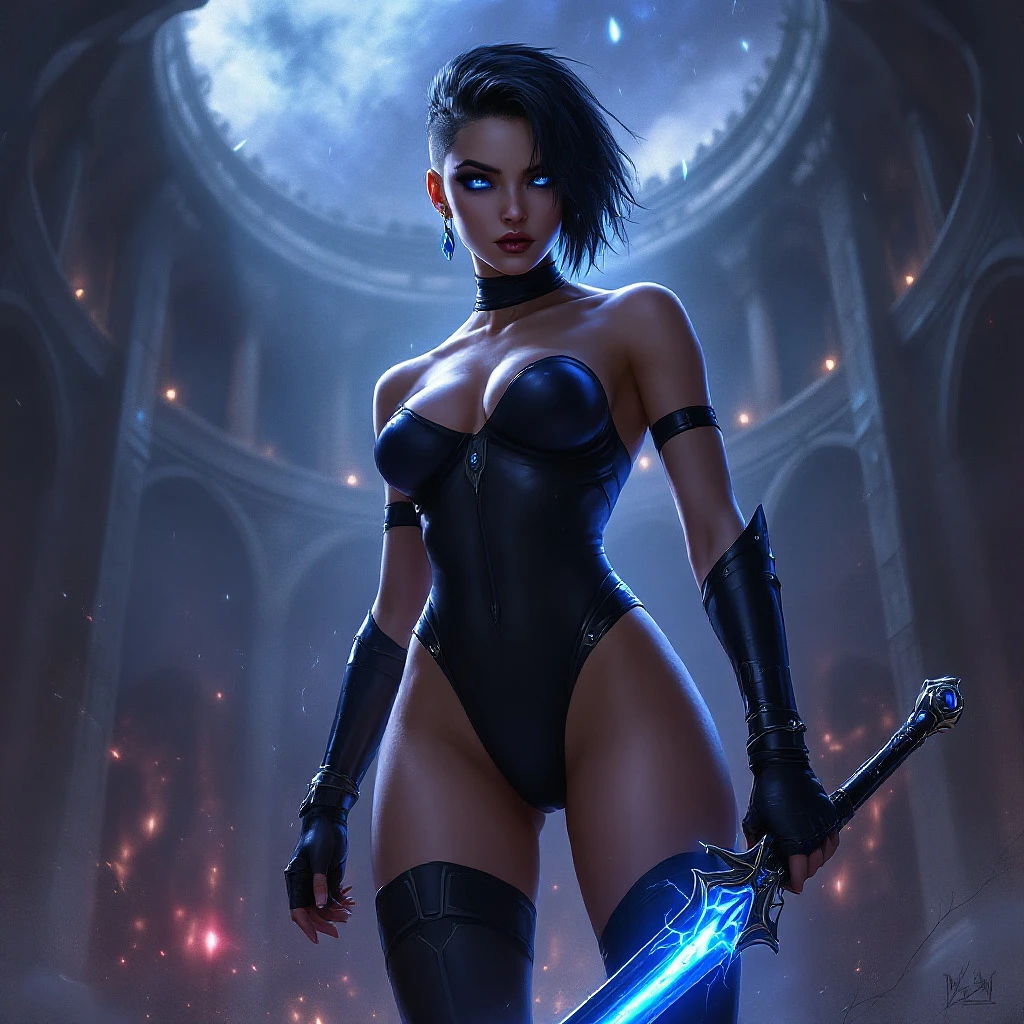 digital painting in the style of warhammer 40k of a young female comissar, standing infront a gothic circh, holding a sabre with blue lightning, cybereyes, black ultra tight onepiece bathsuit, black sidecut hair, very giant tits
