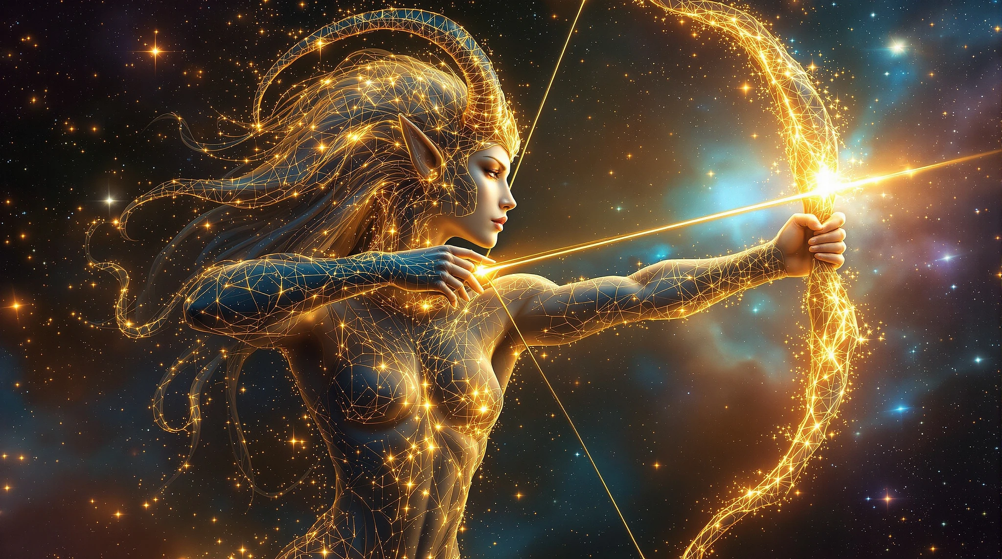A centaur archer humanoid hyper realistic zodiac spirit, embodying Sagittarius, shimmers with stunning detail against a symmetrical, cosmic backdrop of stars and nebulas. Its form is woven with intricate, swirling 3D fractal lights, casting an intense, celestial glow. Focused eyes pierce the stardust-filled sky as it holds a glowing, cosmic bow, exuding ultimate quality and symmetry.