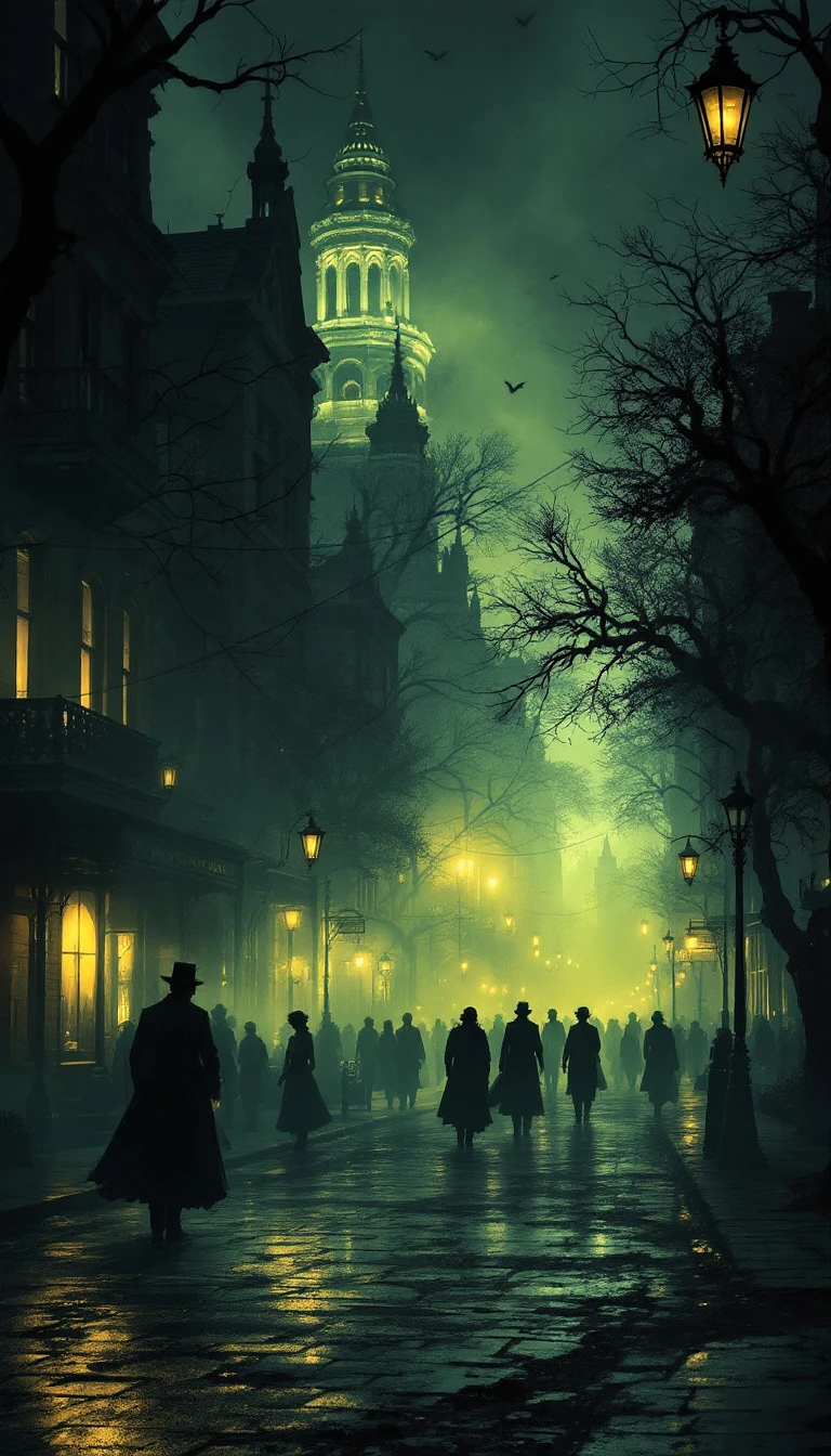 Create a Victorian Penny Dreadful comic-style image depicting the foggy streets of 1880s Austin, Texas. A map of Austin, Texas marked with locations of previous attacks. Flickering lanterns and silhouetted figures in the dark. The atmosphere should feel dark, mysterious, and ominous, with fine detailing reminiscent of Victorian-era illustrations.