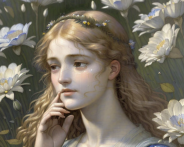 woman crying insipired by Lucien Lévy-DhurmerLe Silence and Albert-Émile Artigue Fleurs de Printemps and Days of Creation (Third) Edward Burne-Jones and Albert Lynch The last rays and Edouard Bisson The Three Grace's and Il canto dell'allodola, Sophie Anderson beautiful and detailed artwork, detailed face, no blur, very detailed face, very detailed eyes, very detailed eyes mouth, realistic, hyperrealistic