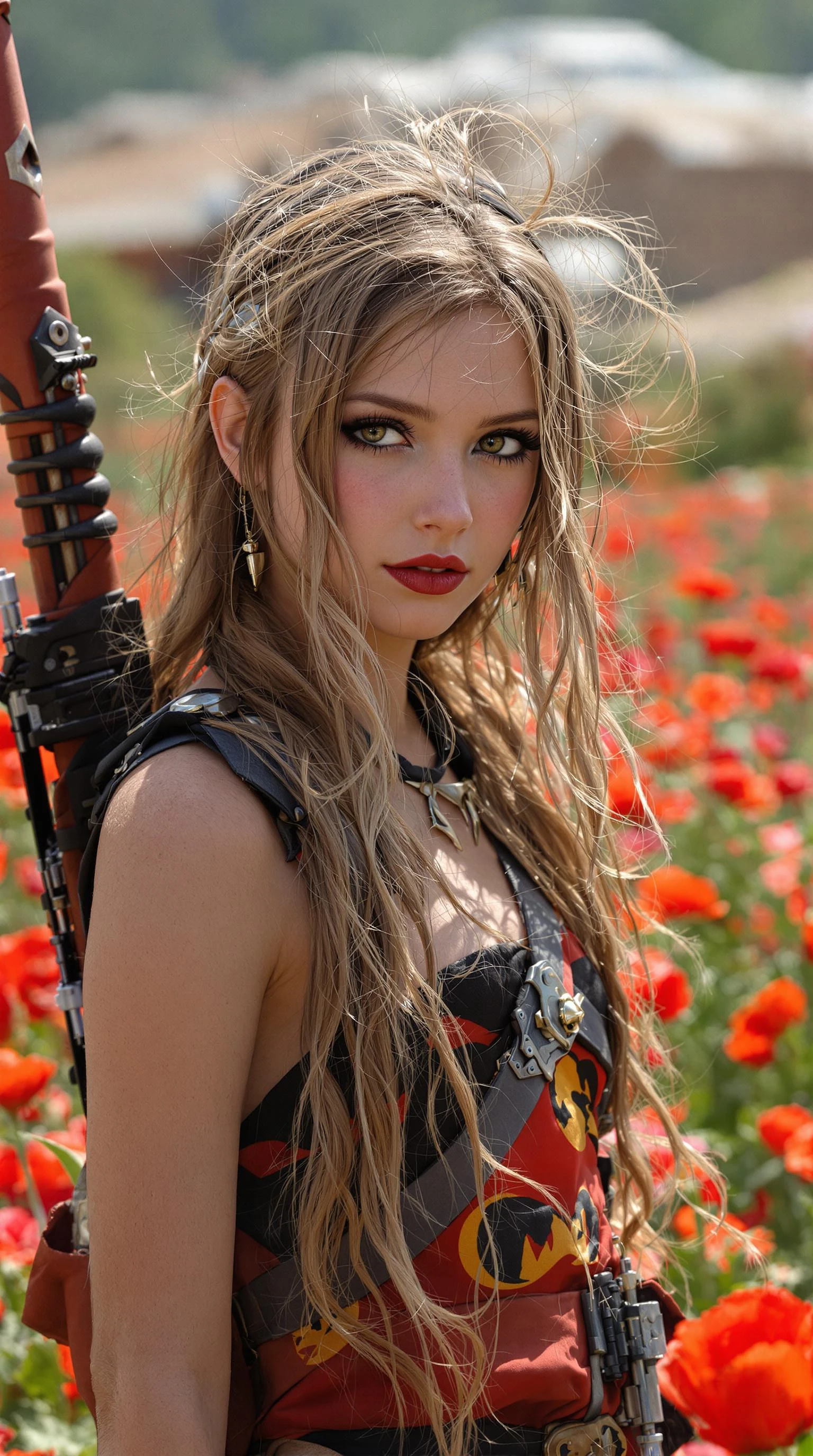 a professional photo of a exceptionally beautiful girl in the world, (age 11) , (eleven year old) of the badlands (futuristic) , (masterpiece) , (realistic) , (perfect anatomy) , (Full body viewing from head to feet) with extremely long light brown hair, flawless olive skin, thick black eye liner, extra long eye lashes, light pink blush, extremely beautifully shaped lips with light apple lipstick, heavy red eye shadow, flawless light olive skin, extremely detailed large beautiful brilliant Forest Tea red-green-blue-silver-brown-golden-grey eyes, (dressed in in the style of a trashy looking baroness from, into the badlands) with a long bow strapped to her back, standing in a poppy field, with a forest way off in the distance high depth of field, gentle expression, 8k, (high res) , ultra-detailed, photo-realistic, full image view, full body view, front view, highly detailed, volumetric, dramatic lighting
