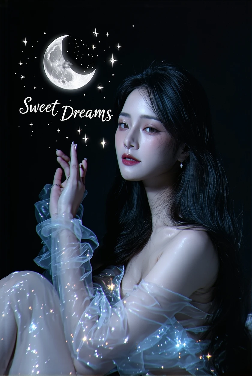 Un portrait fantastique sombre enchanteur et vibrant, capturant une femme aux cheveux longs et flottants et à la peau claire assise à côté d'un croissant de lune brillant. La pièce maîtresse est une écriture dorée qui épelle brillamment « Sweet Dreams », chaque lettre étant accentuée par une étoile unique et brillante. La femme est vêtue d'une robe blanche translucide et éthérée, rappelant l'eau ou la glace, et tend la main vers une étoile brillante. La scène sereine se déroule sur un fond noir profond, mettant en valeur la luminosité de la lune et des étoiles, créant une illusion captivante et cinématographique. , vibrant, cinématographique, photo, illustration, photographie de portrait, dark fantasy