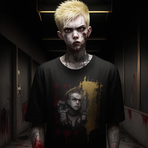 Young man punkcore, Portrait of him standing with pure rage, the once quite park has turned sinister, while standing with his shirt Ripped, covered in blood, The reflection of gold from the park light dim, shines off his his brass knuckles on both hands, which are bruised, At his feet lay 2 bad people At his feet lay 2 lifeless bodies, cinematic, hyperdetailed, ultraviolet,