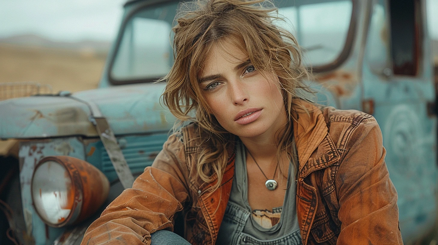 A fashion model held hostage in a Mad Max-style post-apocalyptic wasteland surrounded by rusted vehicles dusty orange tones faded blues gritty browns dystopian realism grungy fashion editorial style angular vehicle parts jagged metal scraps weathered leather textures sun-bleached fabrics rust and grime details harsh desert horizons tattered clothing edges dramatic contrasts tension-filled composition high-fashion meets wasteland grit cinematic lighting --v 6. 0 --ar 16:9 --s 750 --style raw --c 30