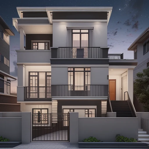 3 story residential house front exterior design, 24x40 size row house, modern look, use night lights, high quality render, 8k