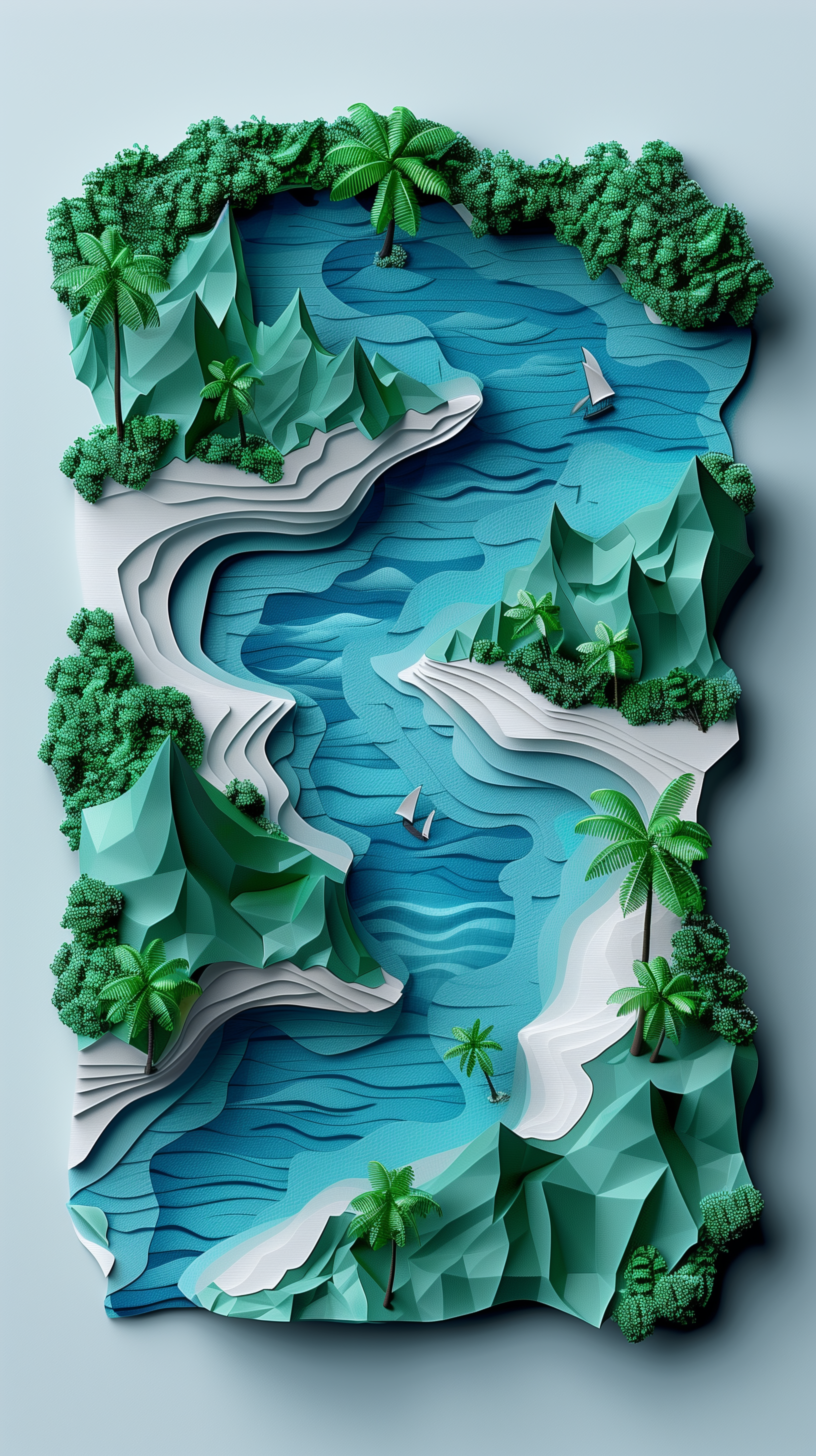 Midjourney prompt: 3d, ocean and island, paper work, cyan, and white ...