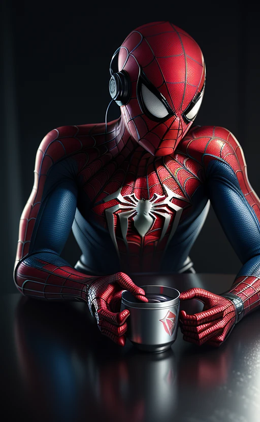earphone on the table with the design and character of spiderman The earphone is gold and red dark, no watermark, no copyright, high gloss, highly detailed, intricate, silver scrollwork, unreal engine 5, octane render, lumen reflections, quixel megascan, 8k, studio lighting, —ar 1080:1920