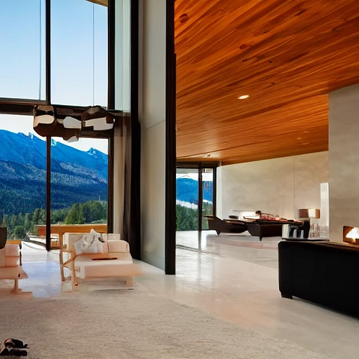 A modern, minimalist dream home nestled in the mountains, with floor-to-ceiling windows offering stunning panoramic views of the surrounding wilderness. The interior is sleek and contemporary, with clean lines and a neutral color palette, featuring state-of-the-art technology throughout, a first-person view