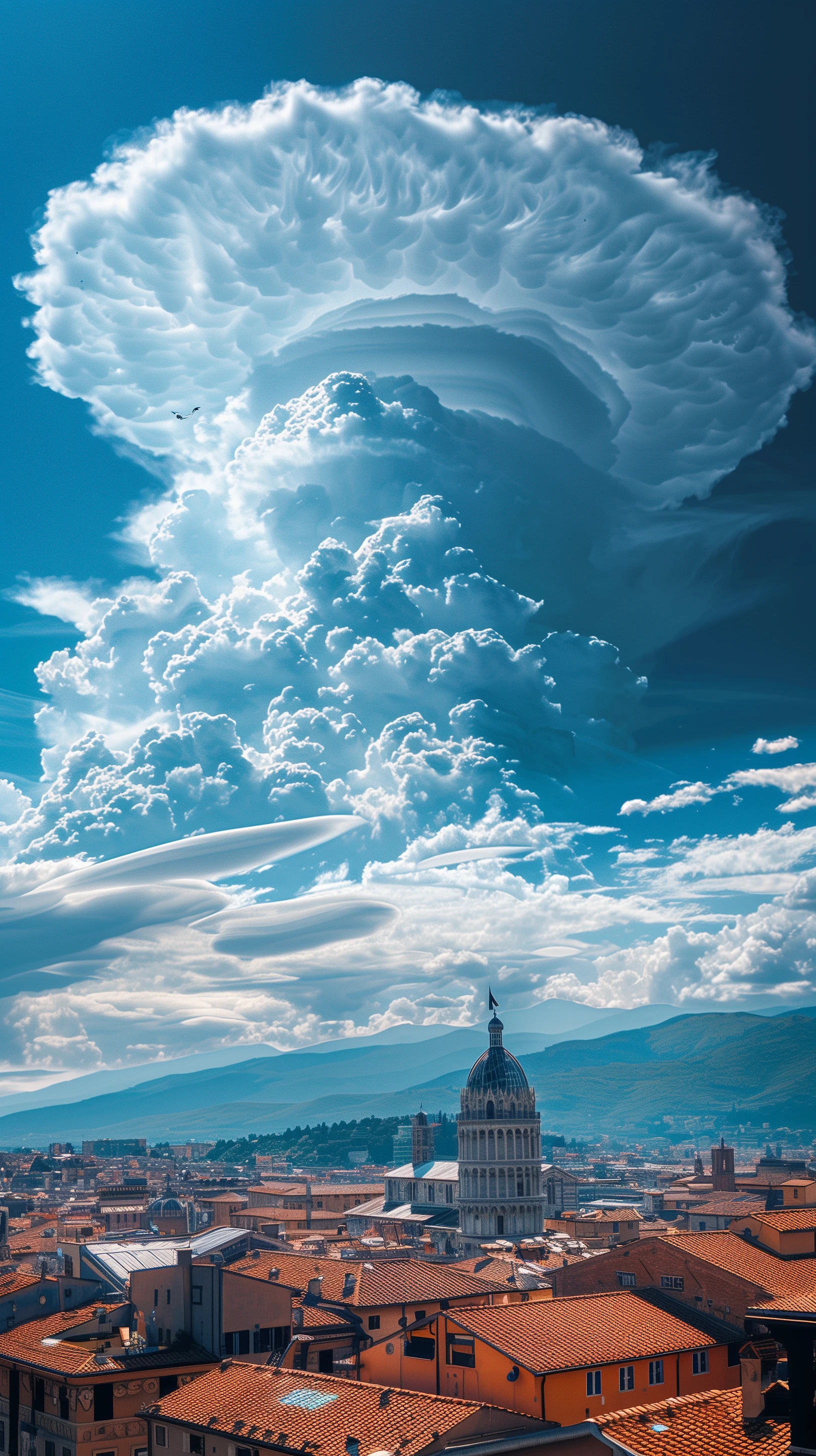 A photo of an alien cloud shaped like the roof and spire of Pisa's cathedral, floating over the city center in Ljub breachinana on a sunny day. The cloud appears to be in the style of Salvador Dali, 8k --ar 9:16 --v 6. 0