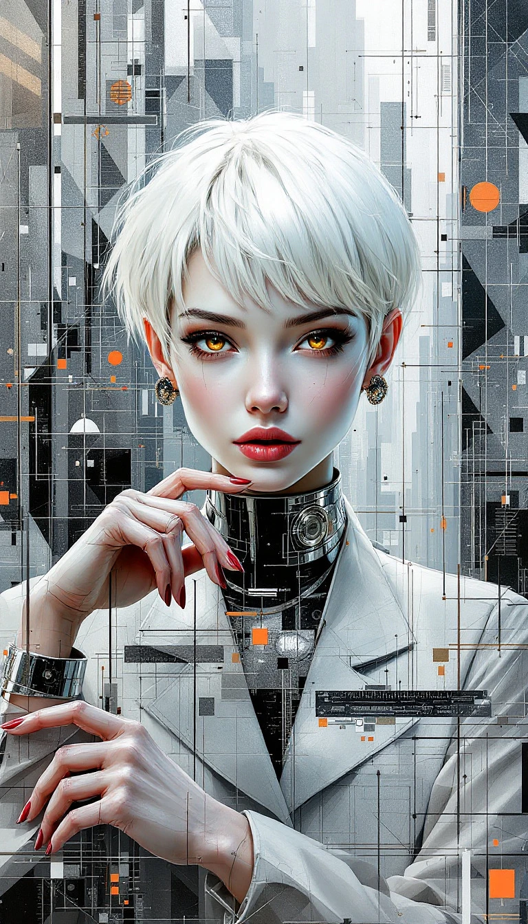 "Silvered Architect in a City of Reflections": A dynamic abstract painting portrays an architect, exhibiting both precision and a visionary style. She is a skilled builder, shown in a city built of glass and silver, where the reflections seem to distort and transform her surroundings, with a pale complexion, short, platinum blonde hair, and a structured, practical uniform with geometric patterns. Blueprints, rulers, and various tools are integrated with her hands and attire. The artwork skillfully blends modern styles with a character study, creating a dynamic and visually striking scene, with a palette of silvers, grays, and whites. Her focused amber eyes, the composition's focal point, convey both a keen intellect and an unyielding sense of purpose. After a long day designing new structures, the architect embodies both creativity and a deep appreciation for the power of design. The clean lines and reflective surfaces invite the viewer to explore the hidden narratives within this vibrant work which is presented as a painting.