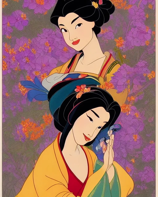 Alphonse Muha, an art nouveau - style Disney Princess Mulan painting. It should be full of details and good quality. Colorful and colorful should be emphasized. HQ, 8K. Flowers, glamour, ornaments, intense light.