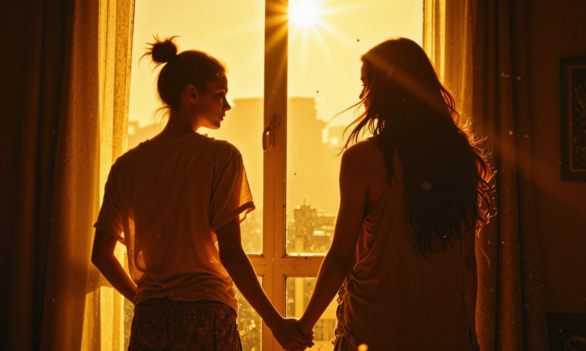 Two adult women in their mid twenties stand at the tall window of their luxury apartment. Morning sunlight pours through, casting golden light across the room and illuminating floating dust in the air. The woman on the left wears a loose t-shirt and pajama shorts, her messy bun catching the warm light. The woman on the right wears an oversized tank top, her hair falling over one shoulder. Their postures are tense—frozen between shock and defiance—as they hold hands tightly, fingers interlocked, drawing strength from each other. The cinematic shot is taken from close behind the two women at a slightly high angle, through the window. Their silhouettes are backlit, caught between the beauty of the sunrise and the horror outside.