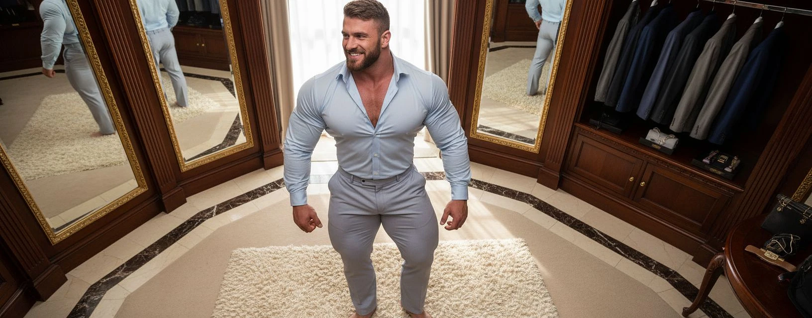 The bodybuilder is 6'4" tall, he has huge muscular shoulders and super extra huge muscular legs. He is wearing tight light-gray dress pants and a neutral baby blue dress shirt. The bodybuilder is looking side ways, his eyes are satisfied. He looks smiley, he is at a luxurious dressing room. The perspective of the image is from the top down.