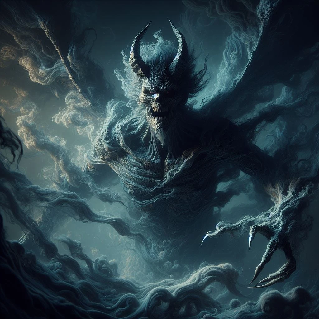 In a dark, ominous realm, Ryomen Sukuna, the ancient, malevolent curse from Jujutsu Kaisen, floats menacingly amidst swirling, ethereal clouds of cursed energy. The artistic 3D portrait captures every intricate, photorealistic detail, as the expert use of volumetric lighting, particle effects, and texture mapping techniques brings the terrifying, powerful figure to life. The eerie, atmospheric environment, the chilling, sinister expression, and the commanding, dominant pose showcase Sukuna's unmatched power, ruthless nature, and insatiable hunger for chaos, resulting in a visually striking, awe-inspiring depiction of the formidable character.