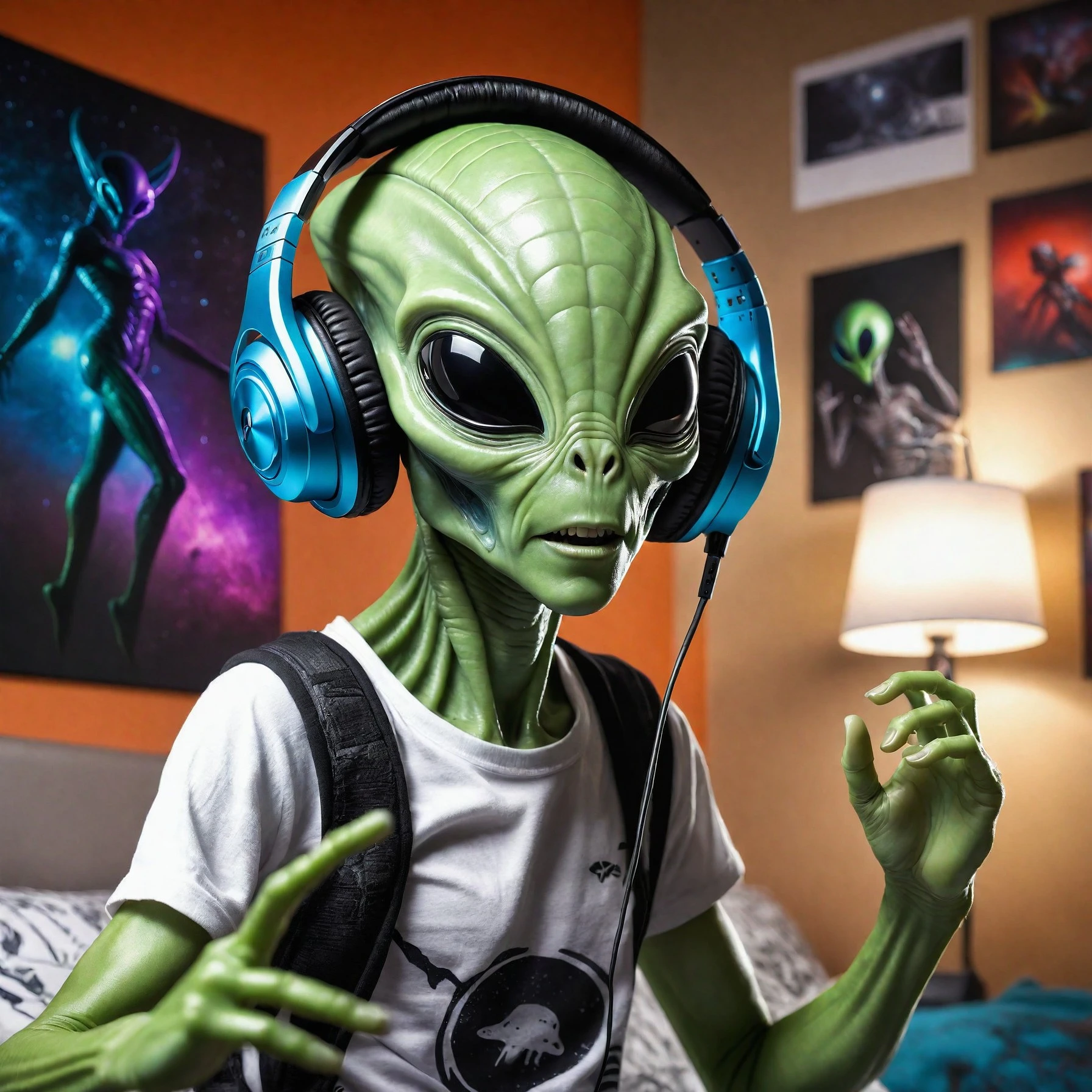 an adorable alien wearing headphones and listening to music, rocking out alone in his room, photorealistic, realistic, highly detailed, 8k, poster of an alien babe on the wall, natural alien skin texture, hyperreal, best quality, looks so real, perfect hands, perfect face, detailed background
