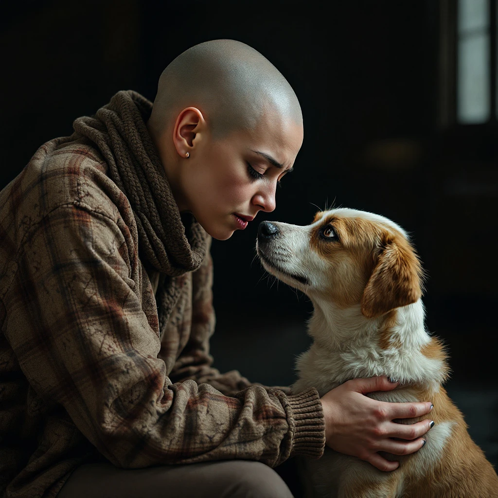 A heartwarming scene of a sad teary eyed bald young woman and a dog sharing a moment of companionship