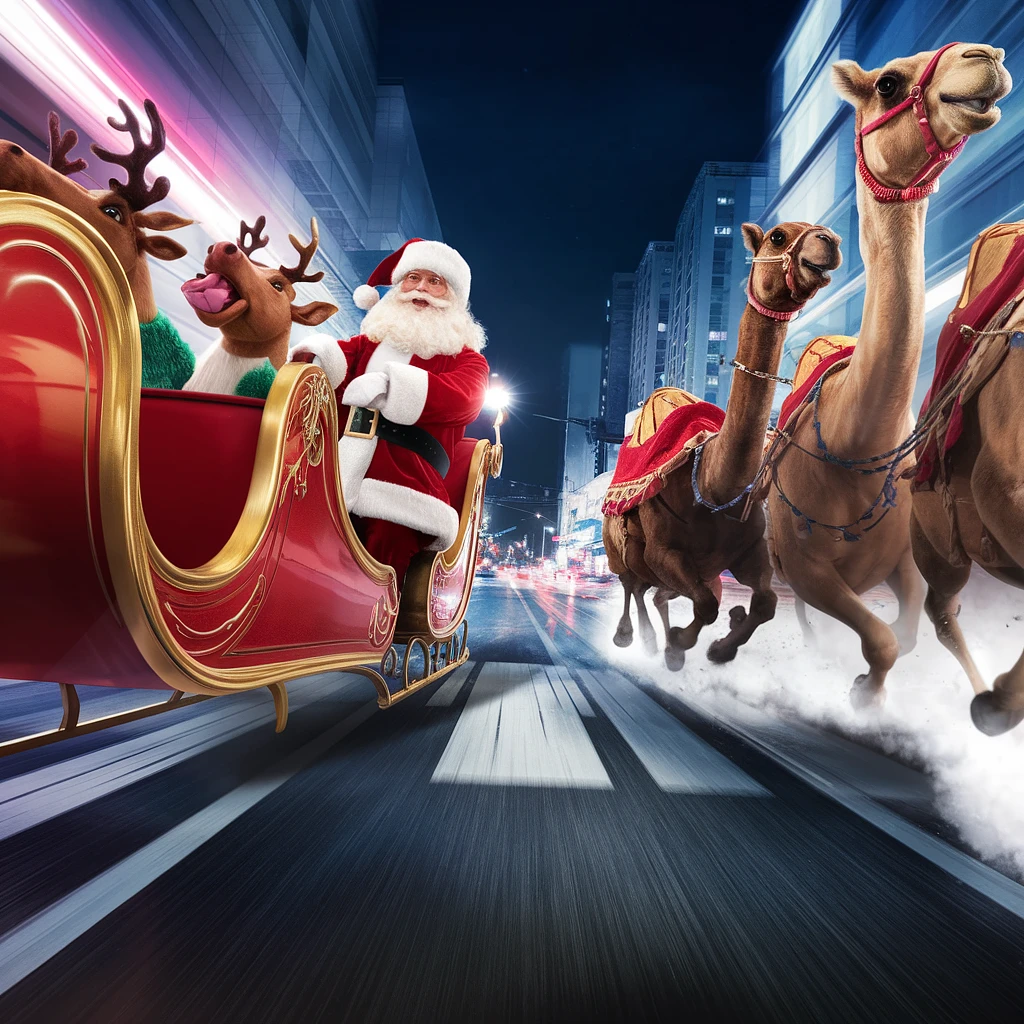 Create a dynamic video sequence featuring a Santa Claus and The 3 Wise Men having a race with Santa's sleigh and the 3 Wise Men's camels, performing a burnout on a bustling street at night. Start with a close-up of the front of the sleigh and camels, showing the neighing coming from the reindeer and camels, and then move to a wide shot that captures the full profile of the sleigh and camels as they accelerate, leaving a trail of smoke. Use a steady camera movement to follow the movement of the sleigh and camels, highlighting the urban backdrop with neon lights reflecting off the surface of the sleigh and camels. Keep a fast pace to highlight the excitement of the scene, ensuring smooth transitions between close-ups and wide shots for a cohesive image.