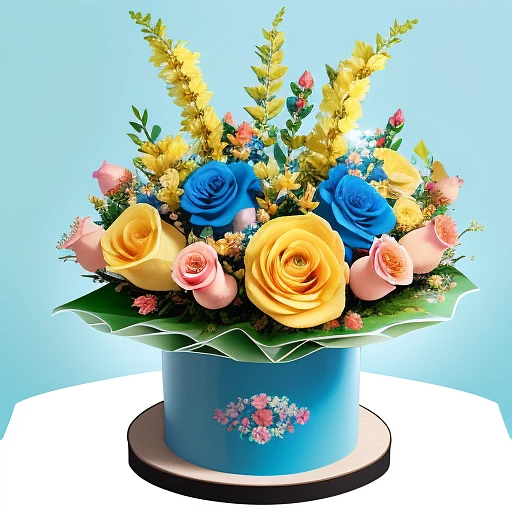 Un arreglo floral, compuesto de flores, multicolores, con Rosas en color azul y moños dorados, variedad de flores en una canasta de mimbre.