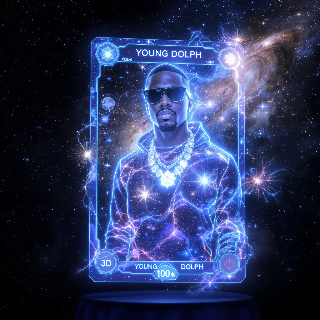 The rapper Yooung Dolph card transforms into a 3D hologram that appears to be made of cosmic energy. As Young Dolph emerges, stars and galaxies swirl around him, creating a sense of traveling through the universe. Young Dolph's attire is adorned with celestial patterns, and his necklace is a glowing star cluster. The hologram floats in front of you, with the background shifting through different cosmic scenes, from nebulae to black holes. Atmosphere: Perfect for space-themed events, science fiction conventions, or futuristic tech expos.