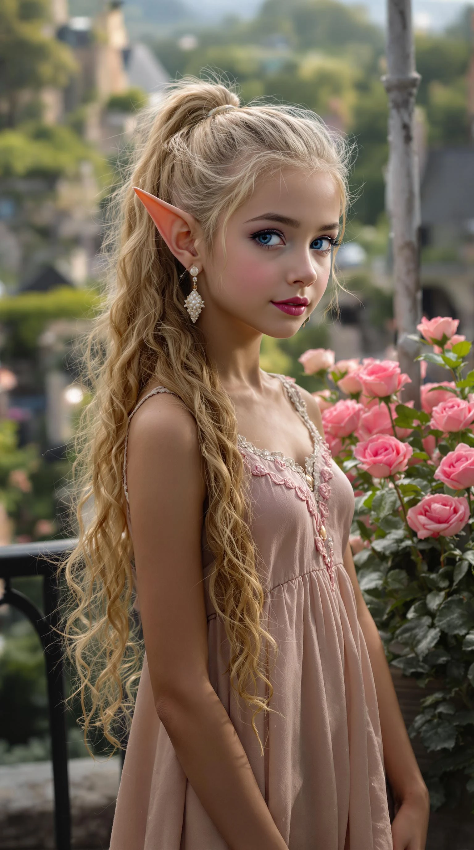 a professional photo of a exceptionally beautiful girl in the world (age 9) , nine year old) short eared elf queen, in a highly detailed, futuristic, (futuristic) , (masterpiece) , (realistic) , (perfect by age anatomy) , (Full body) , (viewing from head to feet) with extremely long light chestnut blonde curly hair in a ponytail, beautifully flawless olive skin, thick black eye liner, extra long eye lashes, light pink blush, extremely beautifully shaped lips with light pink lipstick, blue eye shadow, perfectly flawless olive skin, beautiful perfect high cheekbones beautiful perfect high cheekbones extremely detailed large perfectly shaped beautiful brilliant Forest Tea blue-brown-golden-grey-purple eyes, beautifully manicured fingernail with pink polish, Wearing a delicate sleeveless sleep shirt short lacy Nightshirt, (in the style of the hobbit) standing on a balcony, next to flower pot of long stem pink roses, with a elf village in the background, magical, mystical, high depth of field, gentle expression, 8k, (high res) , ultra-detailed, photo-realistic, full image view, full body view, front view, highly detailed, volumetric, dramatic lighting
