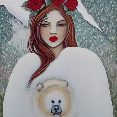 fantasy flowers, a woman with a long blond hair, a white bear, trees and plants, golden lines, a white owl, butterflies on the sky