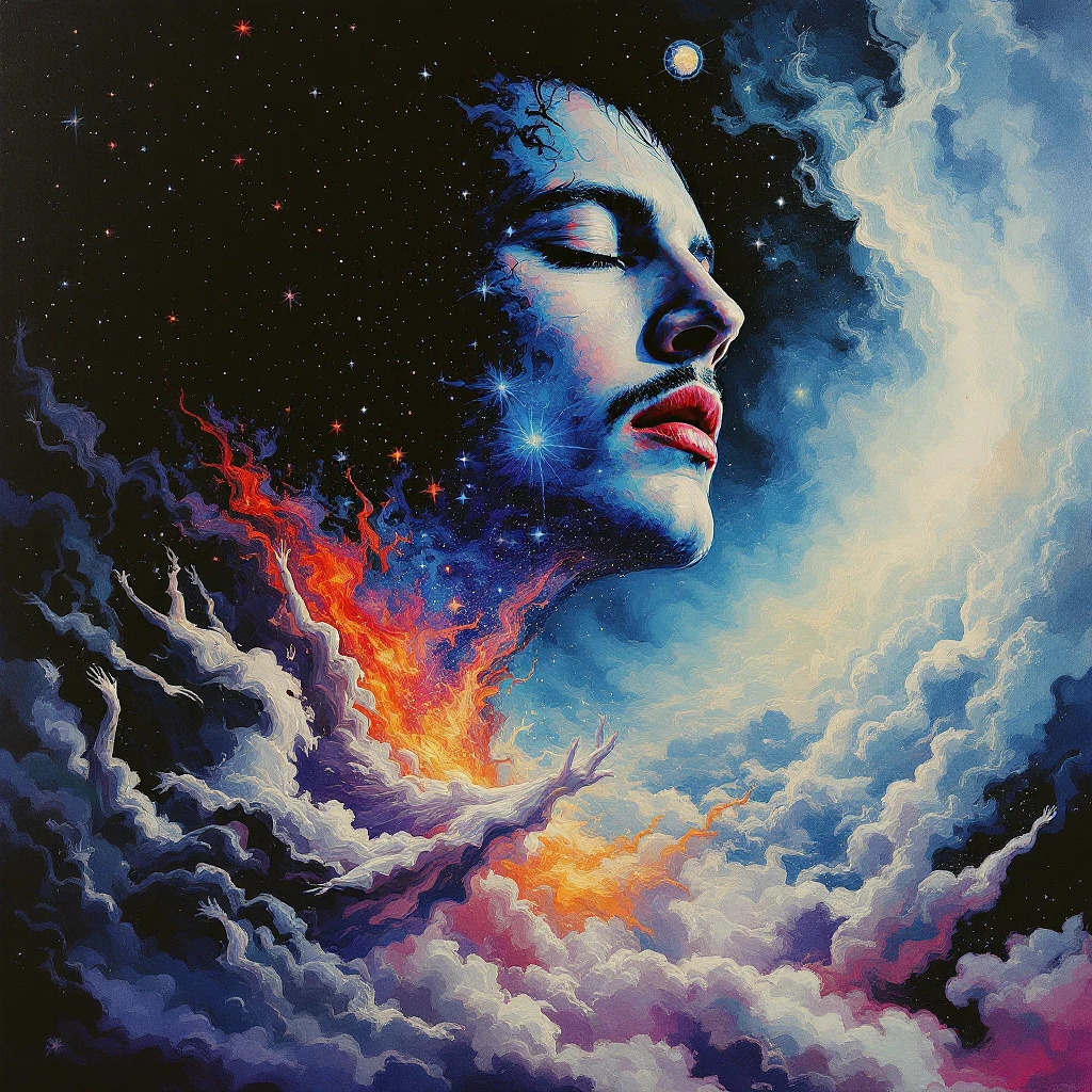 "Bohemian Rhapsody" – Queen Visual Theme: A surreal, theatrical blend of imagery—Freddie Mercury's face dissolving into a galaxy of stars, while ghostly, operatic figures emerge from the swirling clouds. A dramatic scene of death, love, and redemption unfolds in the background. Art Style: Abstract surrealism with bold, contrasting colors and dynamic movement to reflect the operatic and shifting nature of the song.
