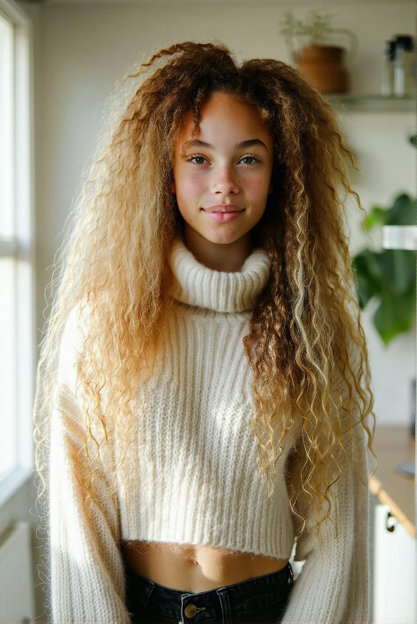 lovely beautiful young girl with long blonde curly soft hair, wears a mohair turtleneck crop-top, morning sunlight in a Swedish house