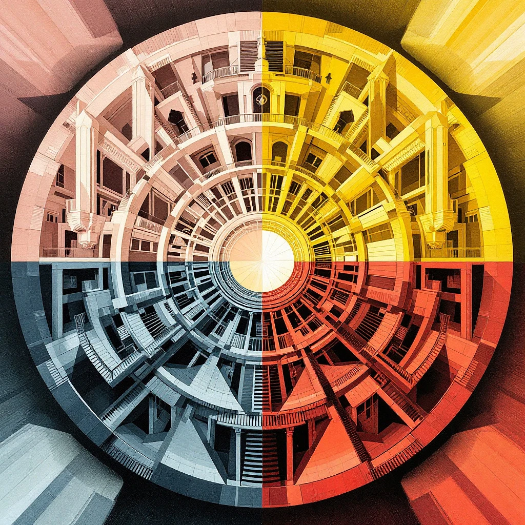 in the style of chiaroscuro technique, suehiro maruo, energy-filled illustrations, cartoon realism, overexposure effect, magali villeneuve, luminous shadowing --ar 31:64 --stylize 750 --v 6. 1 Create a large-scale (36" x 36") geometric family portrait in the style of M. C. Escher's impossible architectures. The composition should be divided into four interconnected quadrants surrounding a central circular element, with each quadrant featuring an impossible staircase rendered in the following scheme: Upper Left - Angel's Quadrant In Bold Lettering : ANGEL Base color: Rose pink with darker pink shadows Impossible staircase ascending counter-clockwise Architectural details suggesting a gentle, ethereal quality Subtle textile patterns incorporating feather motifs Upper Right - Kurt's Quadrant In Bold Lettering : KURT Base color: Warm yellow with golden undertones Impossible staircase ascending clockwise Strong, bold architectural lines Geometric patterns suggesting strength and stability Lower Left - Alex's Quadrant In Bold Lettering : ALEX Base color: Deep coral red with burgundy shadows Impossible staircase descending counter-clockwise Dynamic architectural elements suggesting movement Tessellated patterns with sharp, precise edges Lower Right - Haley's Quadrant In Bold Lettering : HALEY Base color: Soft purple with lavender highlights Impossible staircase descending clockwise Flowing architectural details suggesting grace Intricate patterns incorporating natural elements Central Element: In Bold Lettering : MITCHELL A perfect circle containing the word 'FAMILY' Design the circle as a portal where all staircases seem to both emerge from and return to Include subtle metallic gold leaf detailing around the edges Create an optical illusion where the circle appears to both recede and project Technical Specifications: Medium: Mixed media combining precise pen and ink work with watercolor washes Paper: Archival quality, heavy weight (300gsm) cotton paper Rendering Style: Combine mathematical precision of impossible geometries with organic, flowing elements Lighting: Each quadrant should feature its own light source, creating impossible shadows that add to the paradoxical nature Texture: Include subtle crayon-like textural elements as a homage to the original drawing Scale: Gradually decrease the size of architectural elements as they approach the center, creating a sense of infinite regression Additional Notes: Maintain clean, precise linework characteristic of technical architectural drawings Include subtle references to family unity through interlocking patterns between quadrants Create seamless transitions between color zones while maintaining distinct quadrant identities Incorporate microscopic details that reward close inspection Ensure that each impossible staircase, while distinct, contributes to a unified circular flow around the central element The final piece should honor the emotional authenticity of the original family drawing while elevating it through sophisticated