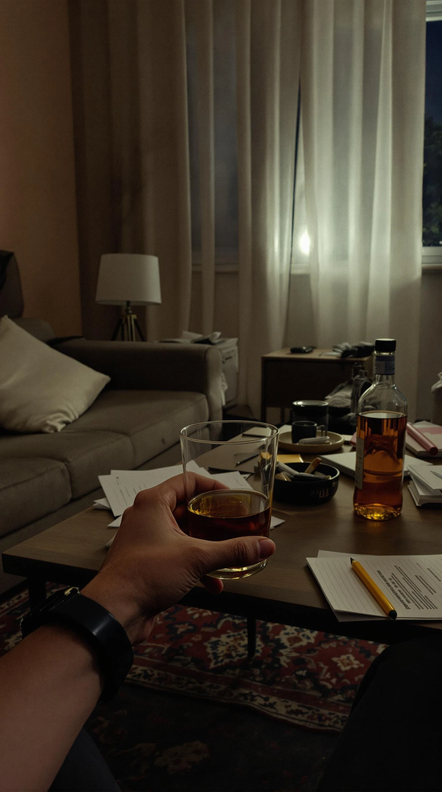 In the same house, I’m sitting at the table, drinking liquor. A cigarette, smoking gently, rests in an ashtray nearby. In my hand, I hold a glass of liquor. The bottle of liquor is placed on the table. Only my hand is visible in the frame, holding the glass. The room is small and minimalist, with a cozy, slightly disorganized feel. Papers and a notepad are scattered on the coffee table. The modern Iranian decor still stands, with neutral-toned furniture and clean lines. A Persian rug is underfoot, its intricate patterns adding character to the otherwise simple space. It’s nighttime, and the room is dimly lit, with soft light from the window filtering through. The atmosphere is quiet and relaxed, with a warm, peaceful vibe despite the darkness outside. The room feels inviting, perfect for a calm evening.
