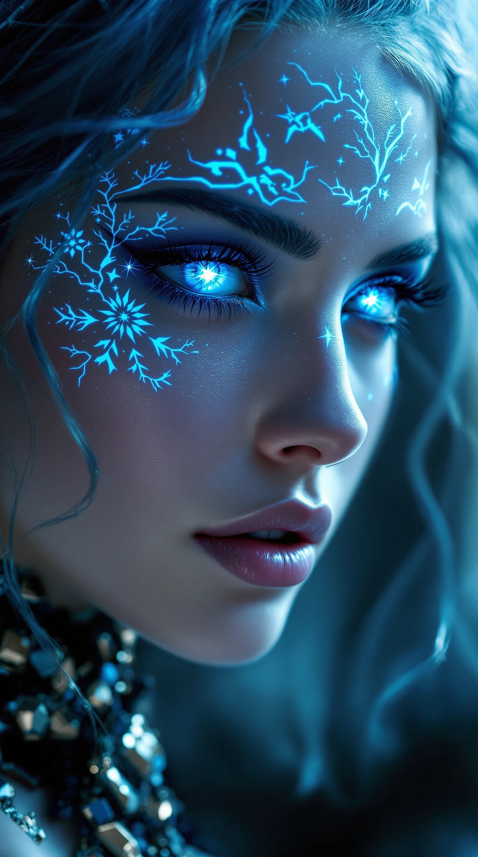 a professional photo of a exceptionally of the most beautiful (age 40) girl angel, Detailed illustration of a angel girl with blue face tattoos and ice glowing eyes, blue hair (masterpiece) , (realistic) , (Full body) fantasy, highly realistic, atmosphere, intricate details, blue glowing markings on skin, 4k resolution (8k) , (high res) , ultra-detailed, photo-realistic, front view, highly detailed, volumetric, dramatic light Perfect graphics, ultra-detailed, photo-realistic, full image view, full body view, front view