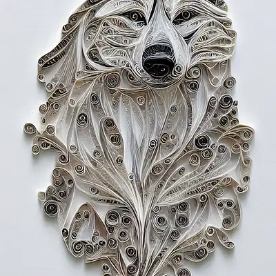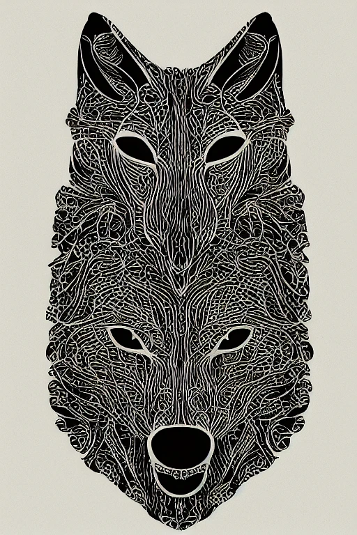 Wolf drawn in laser cut printing style. The background is filled with intricate patterns and decorations, including shells, seaweed. beautifully designed image, black and white, clear lines, detailed, line drawing, no grey areas, just black lines and pure white between lines, line patterns, not so small patterns, no black areas, just black lines, no black patches