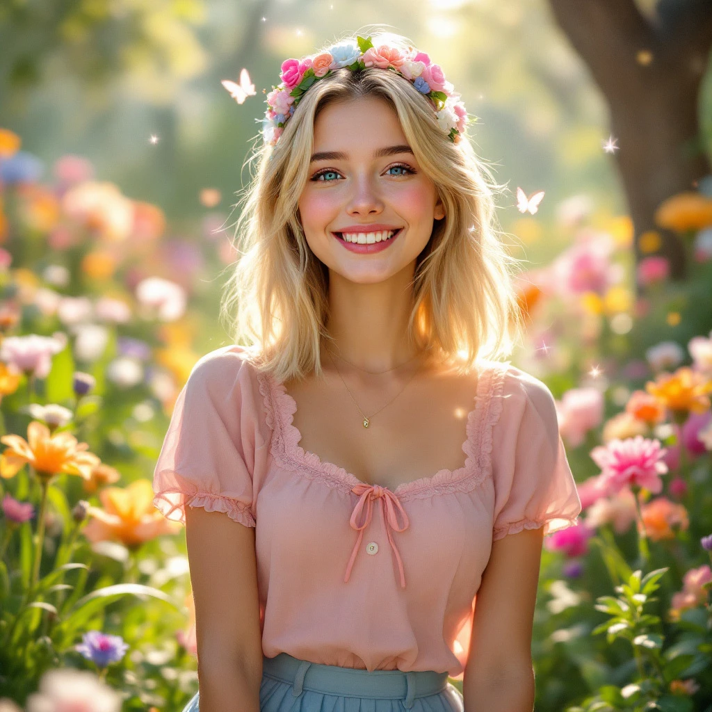 A cheerful, blonde woman stands in a bright, whimsical garden filled with blooming flowers, lush green grass, and colorful butterflies fluttering around. Her hair is shoulder-length, straight, and golden, catching the sunlight with a soft shine. She has a radiant, genuine smile that lights up her face, featuring clear blue eyes and a gentle, friendly expression. Her skin is fair and smooth, with a natural, fresh glow. She wears a cute, playful outfit: a pastel pink, short-sleeved blouse with delicate lace details and a small bow at the collar, paired with a light blue, high-waisted skirt that reaches just above her knees. The skirt has subtle ruffles, adding to her charming appearance. On her feet, she wears white sneakers with cute pastel accents and ankle socks. Her accessories include a small floral headband in her hair and a dainty necklace. The environment exudes happiness and innocence, with sun rays filtering through the trees, casting a warm glow, and tiny sparkles or fairy dust adding a magical touch. Overall, she radiates joy, youthful energy, and a charming, approachable vibe.