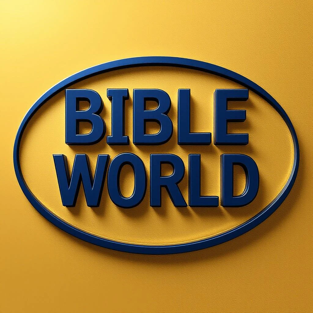 3D logo design featuring indigo text BIBLE WORLD on a gold background. Include an oval around the lettering as an additional design element. --v 5