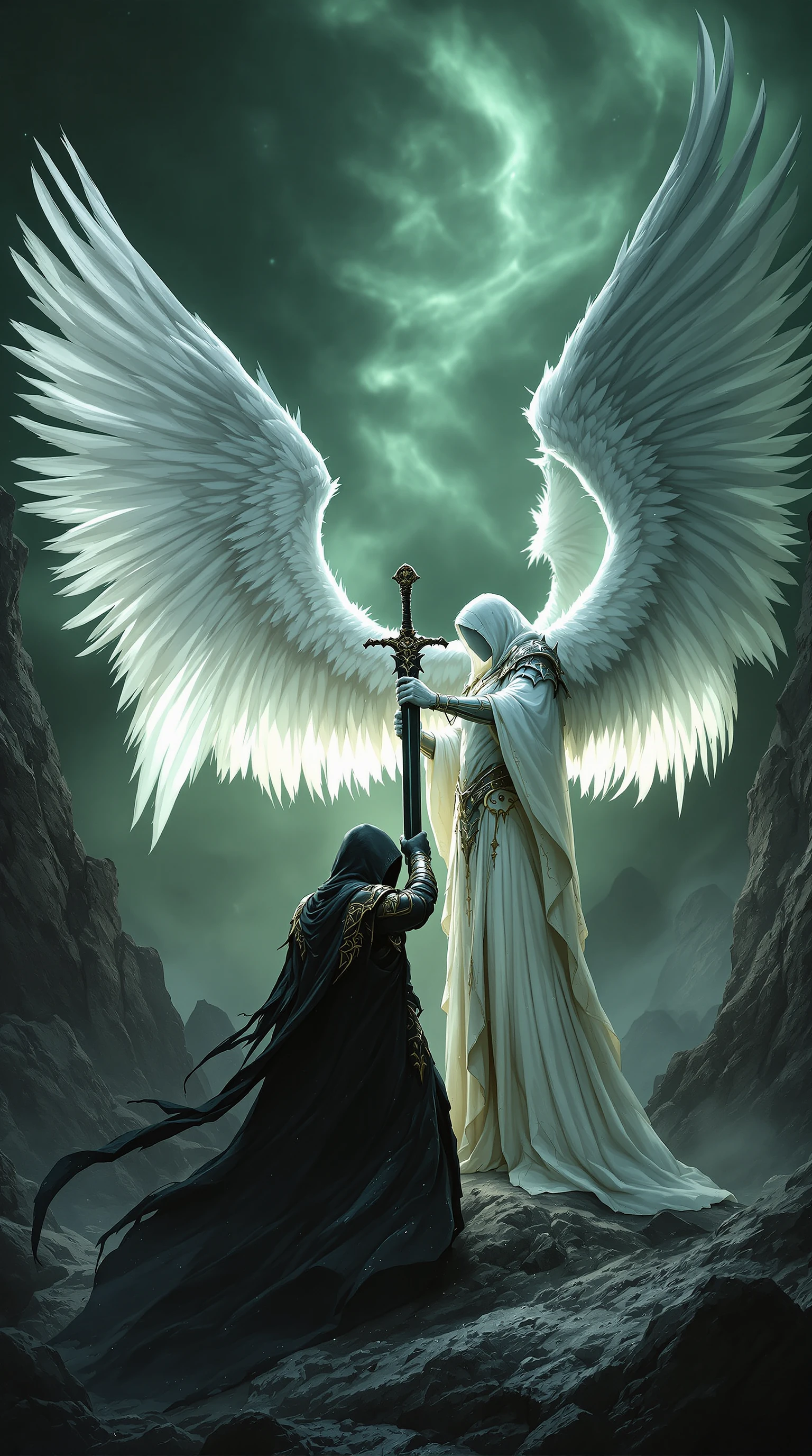 A dramatic, cinematic confrontation between two opposing angelic warriors, one cloaked in darkness and the other bathed in light. The dark angel, shrouded in a hooded black robe adorned with intricate armor engravings, has massive, tattered black wings.