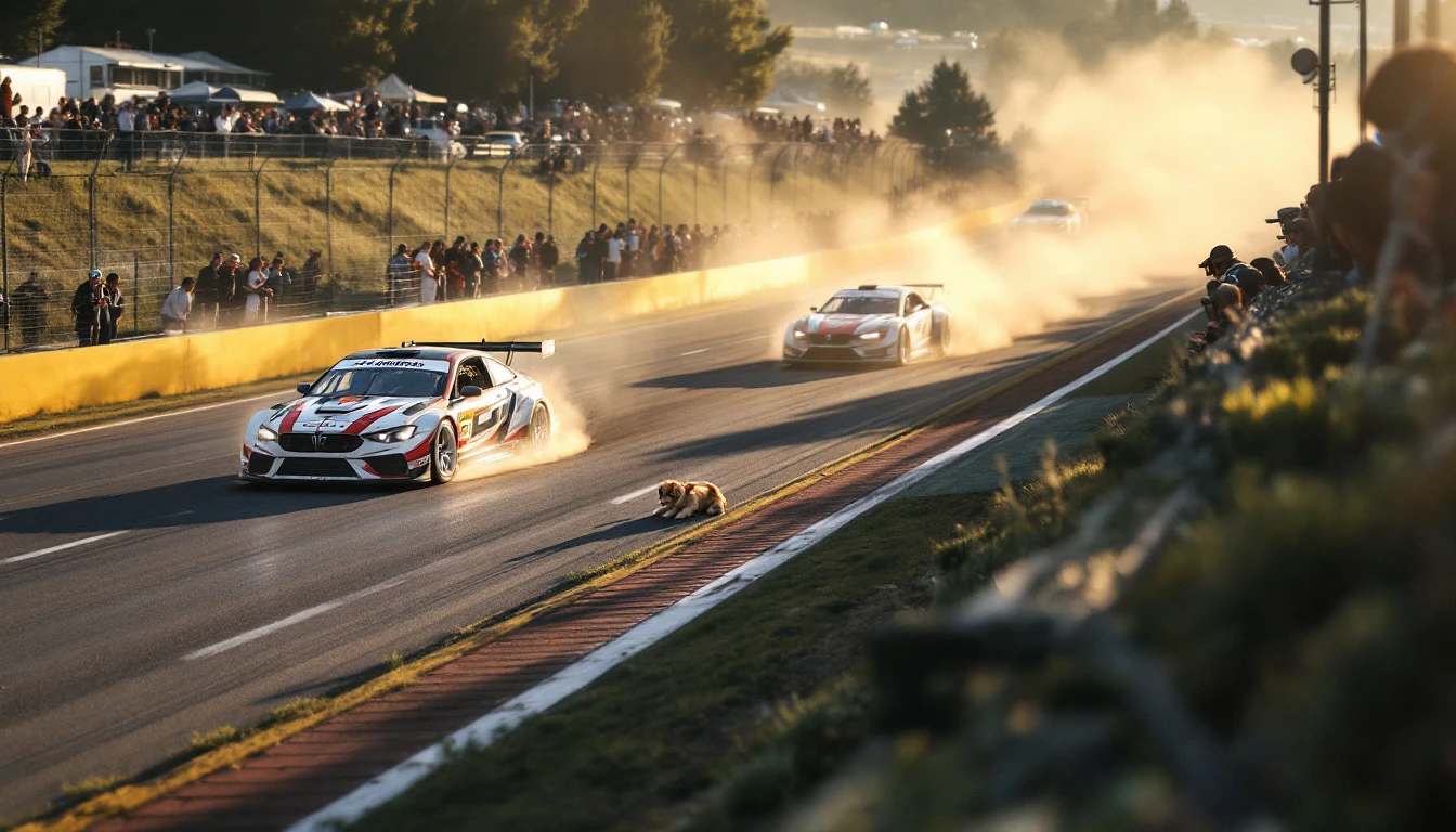 The race track is well lit by sunlight. A car with the club logo on the sides rushes along the track. Light smoke and sand from under the wheels. A racing driver makes a sharp turn to avoid a collision. A small puppy lies next to a passing car, clinging to the highway. Spectators stand outside the track fence. The camera looks from the side and slightly from above and turns behind passing cars.