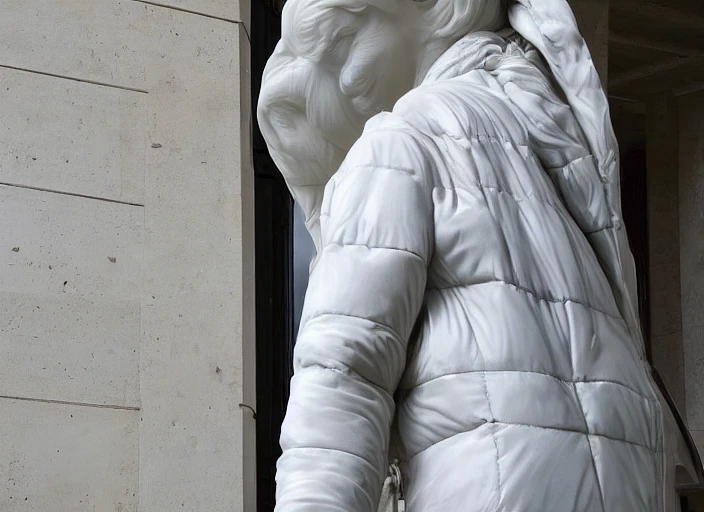 beautifully lit portrait of extremely beautiful female marble statue wearing huge over size puffer jacket by dingyun zhang, the statue is made of white marble with cracks and flaws, white hair, white eyes, white face, black and white photo, avant garde, haute couture, bubble jacket, puffer jacket, puffer pants, puffer dress, puffer shoes, puffer pants, snow suit, moncler genius, craig green, sharp focus, clear, detailed, , cinematic, detailed, off white, glamourous, symmetrical, vogue, editorial, fashion, magazine shoot, glossy