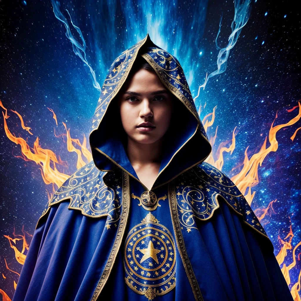 a powerful human mage wearing a cloak (intricately detailed fabric) with stars and galaxies on ceiling, depth of field, fire, magic, blue flames, underground, water, 8k, masterpiece, vibrant, Albert Bierstadt, artgerm, trending on artstation, highly detailed, mist, portrait, volumetric lighting