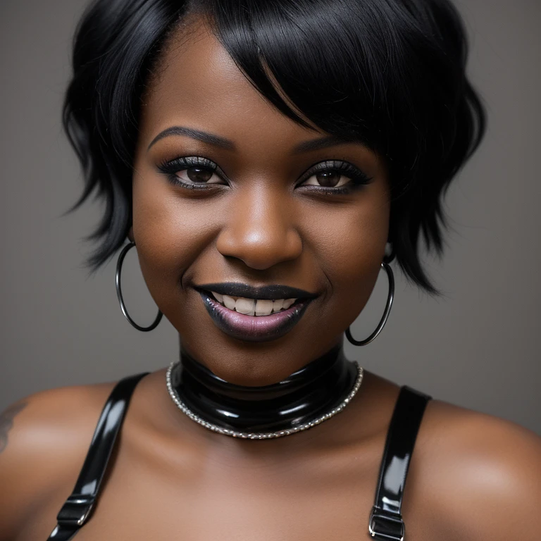 hyper realistic headshot photo of a 25 year old black woman, wearing a latex corset, black short hair, black lipstick, black jewlery, looking into the camera, smiling slightly, Extreme Close-Ups, Full Frame camera, ISO: 32000, Aperture (f-stop) : f/16, Shutter Speed: 1/30, Camera Lens: 85mm prime lens, Camera Eye Line: Low, Studio Lightning