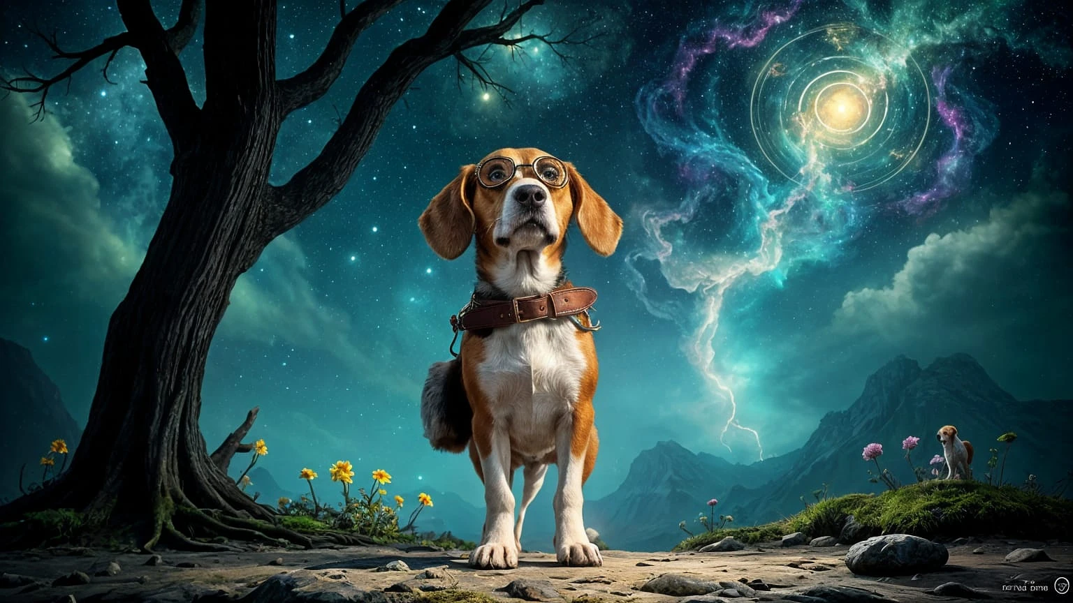 A lone beagle, adorned with intricate brass goggles and a leather satchel, stands at the edge of a bioluminescent forest. Ancient trees with glowing moss and ethereal flora surround it, hinting at otherworldly beauty. The beagle gazes towards a sky filled with swirling nebulae and distant, alien constellations. This scene is rendered in a whimsical fantasy painting style, with elements of storybook illustration and a touch of magical realism, evoking a sense of serene nature and . . .