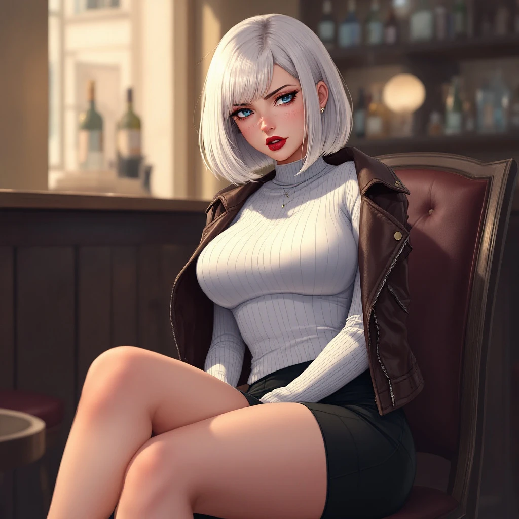 anime, woman, white hair, bob cut, blue eyes, freckles, red lips, white sweater, tight sweater, short leather jacket, brown leather jacket, black tight skirt, short skirt, bare legs, black high heels, irritated expression, sitting on a chair, sitting with legs crossed, big chest, in a bar, holding a cigarette on the right hand