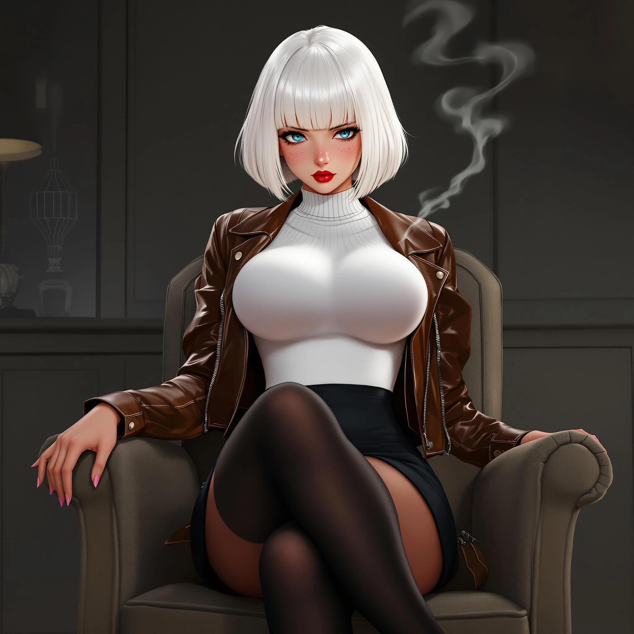 anime, woman, white hair, bob cut, blue eyes, freckles, red lips, white sweater, tight sweater, short leather jacket, brown leather jacket, black tight skirt, black stockings, black high heels, bored expression, sitting on a chair, sitting with legs crossed, big chest, smoking