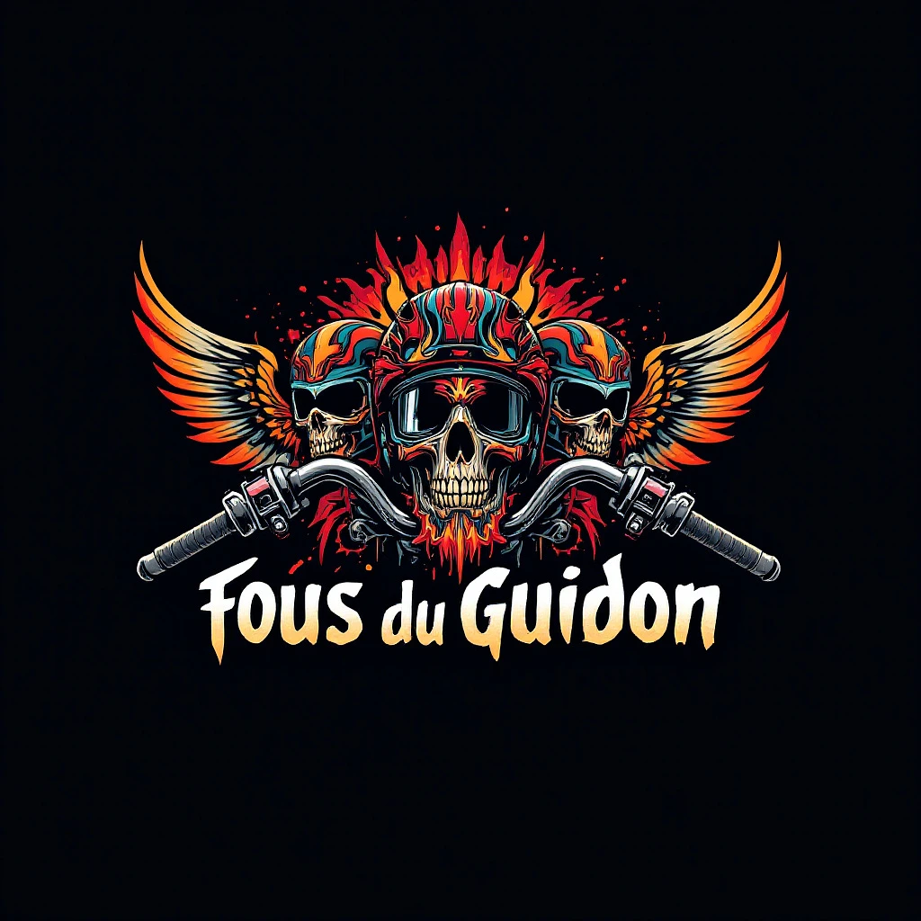 Create a bold and exciting logo for "Fous du Guidon", a brand related to the world of motorcycling. The logo should prominently feature a motorcycle handlebar and several motorcycle helmets, alluding to the brand's connection to the motorcycle world. The design should be in a similar style to the provided reference image, with strong lines, detailed illustrations, and vibrant colors against a dark background. The text "Fous du Guidon" should be bold and integrated into the design, complementing the handlebar motif. To reflect a sense of madness and excitement, add dynamic elements such as swirling patterns, vibrant splashes of color, and exaggerated expressions or designs on the helmets. Incorporate additional elements, such as gears or wings, to enhance the motorcycling theme and add dynamism to the logo.