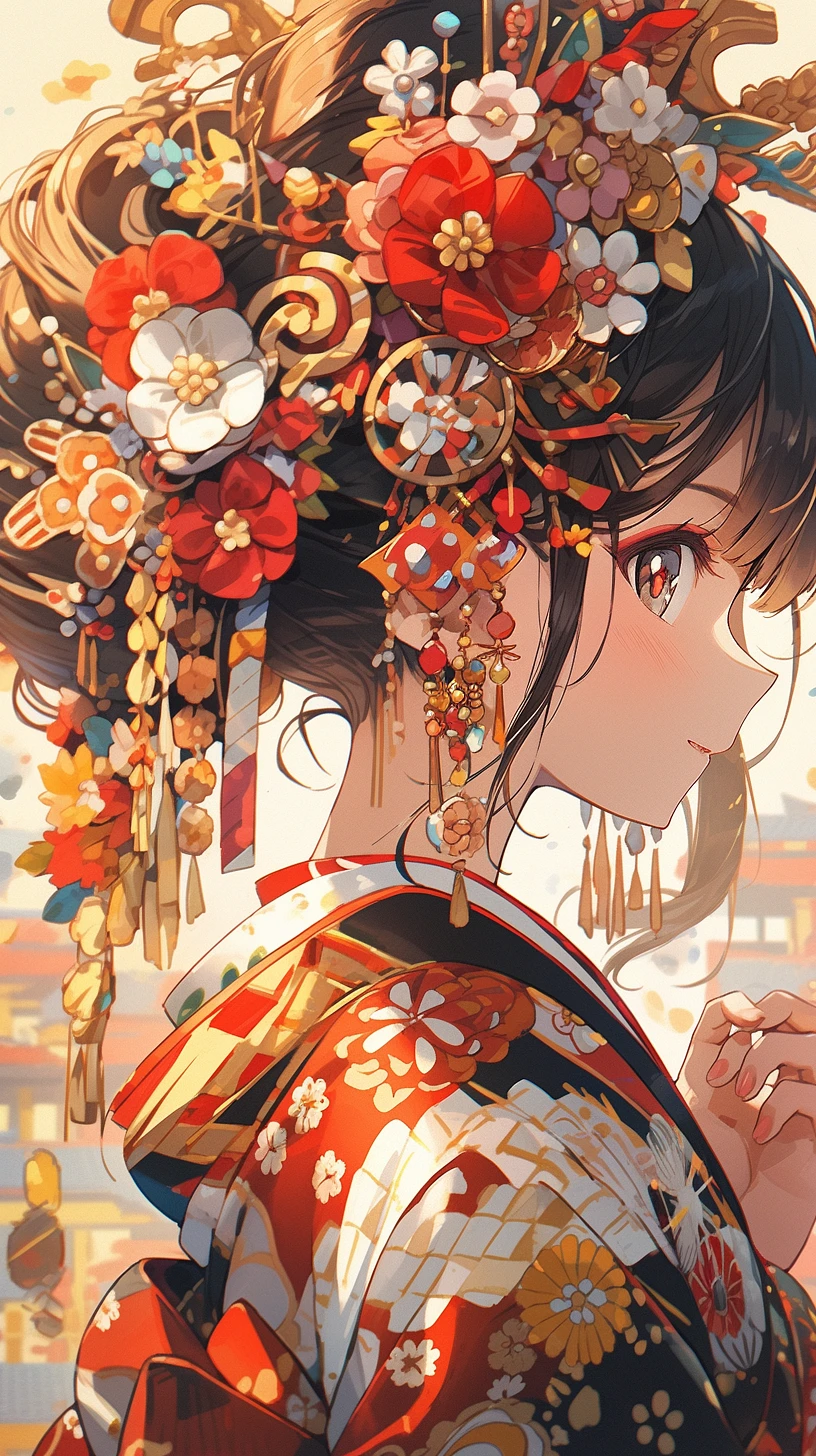 an illustration of a samurai girl with a colorful headdress, in the style of colorful complexity, mind-bending murals, anime-inspired characters, i can't believe how beautiful this is, warm color palette, puzzle-like elements, multilayered dimensions --ar 9:16 --s 750 --niji 5