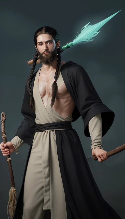 A 24 year old human wizard. He is of average height and has green eyes and black hair. He has a wiry, athletic frame. His hair is shoulder length and tied back. His beard is short, with two braids extending to his collarbone. He is wearing fabric robes and wields an arcane staff.