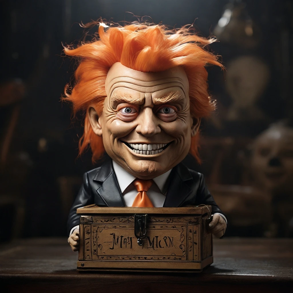 In the scene stands a grotesque Jack-in-the-Box, its eerie visage bearing the features of former President Donald Trump. His face, contorted into a wide grin, exudes an uncanny aura of power and despotism. The Jack-in-the-Box's eyes are alive with malevolence, and its mouth is twisted into a menacing smile, baring its teeth and spreading an aura of unease. Its orange-colored hair is wild and untamed, a grotesque veil over its eerie countenance. With an ominous twist of the crank, the melody of the Jack-in-the-Box is activated, a haunting tune that speaks of the dark machinations and ruthless tactics of the former president. With each turn of the crank, the tension mounts, until finally, a frightening figure springs from the box, bearing an unmistakable resemblance to Donald Trump.