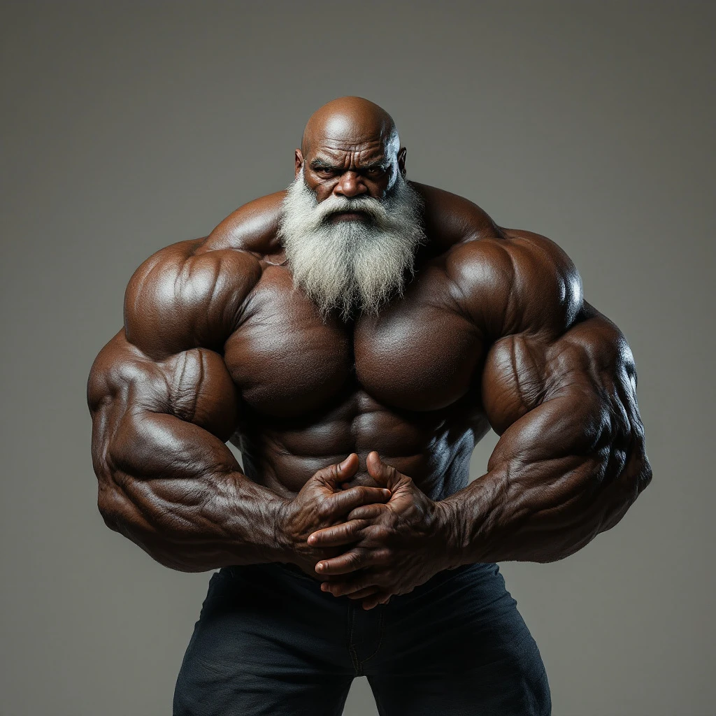 A huge muscled black grandpa who is bald with a big beard, hairy chest, and is flexing and showing off his body
