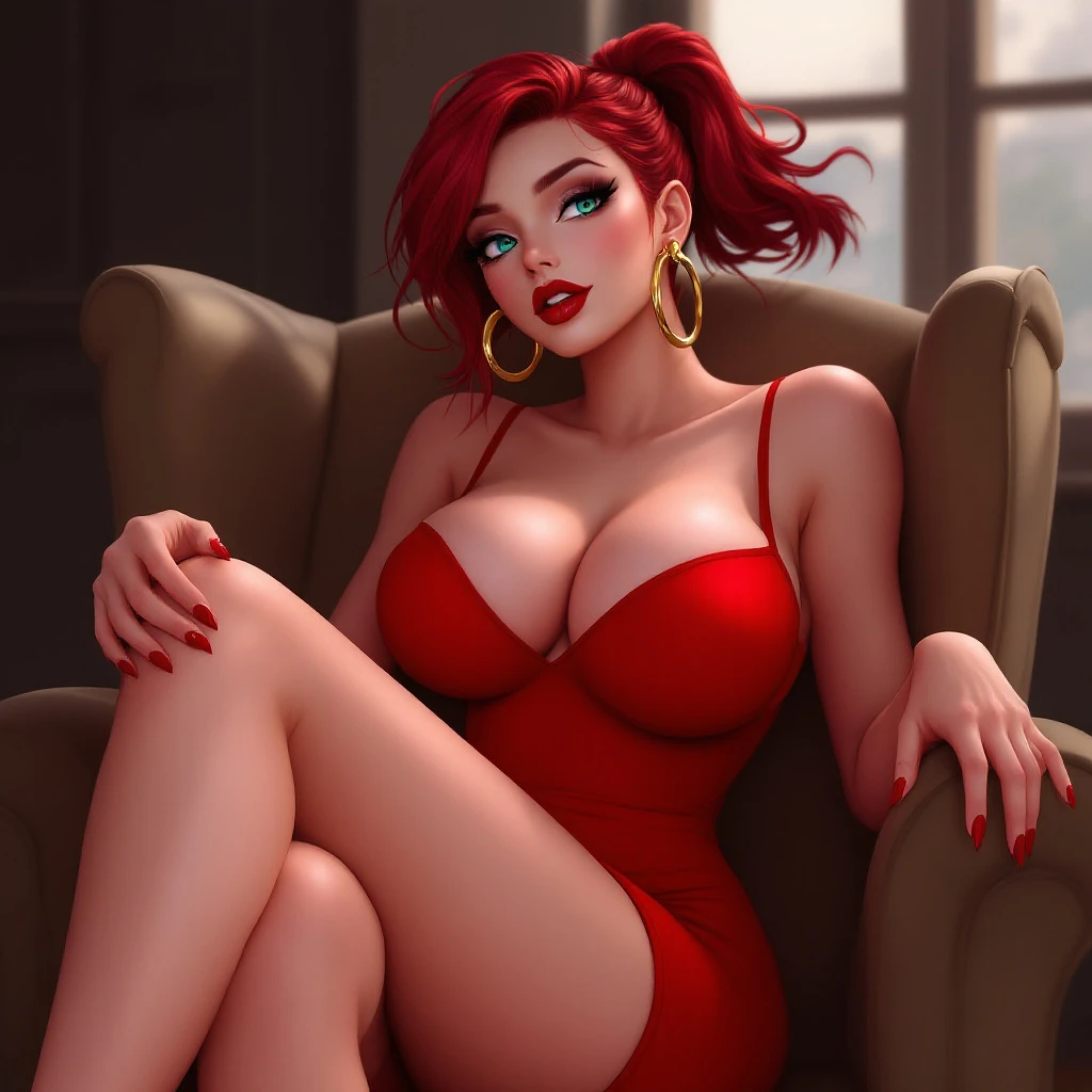 anime, woman, red hair, short ponytail, cyan eyes, red lips, red bodycon dress, tight dress, red high heels, round golden earrings, bare legs, closed cleavage, massive chest, bare arms, with straps, sitting on a chair, legs crossed