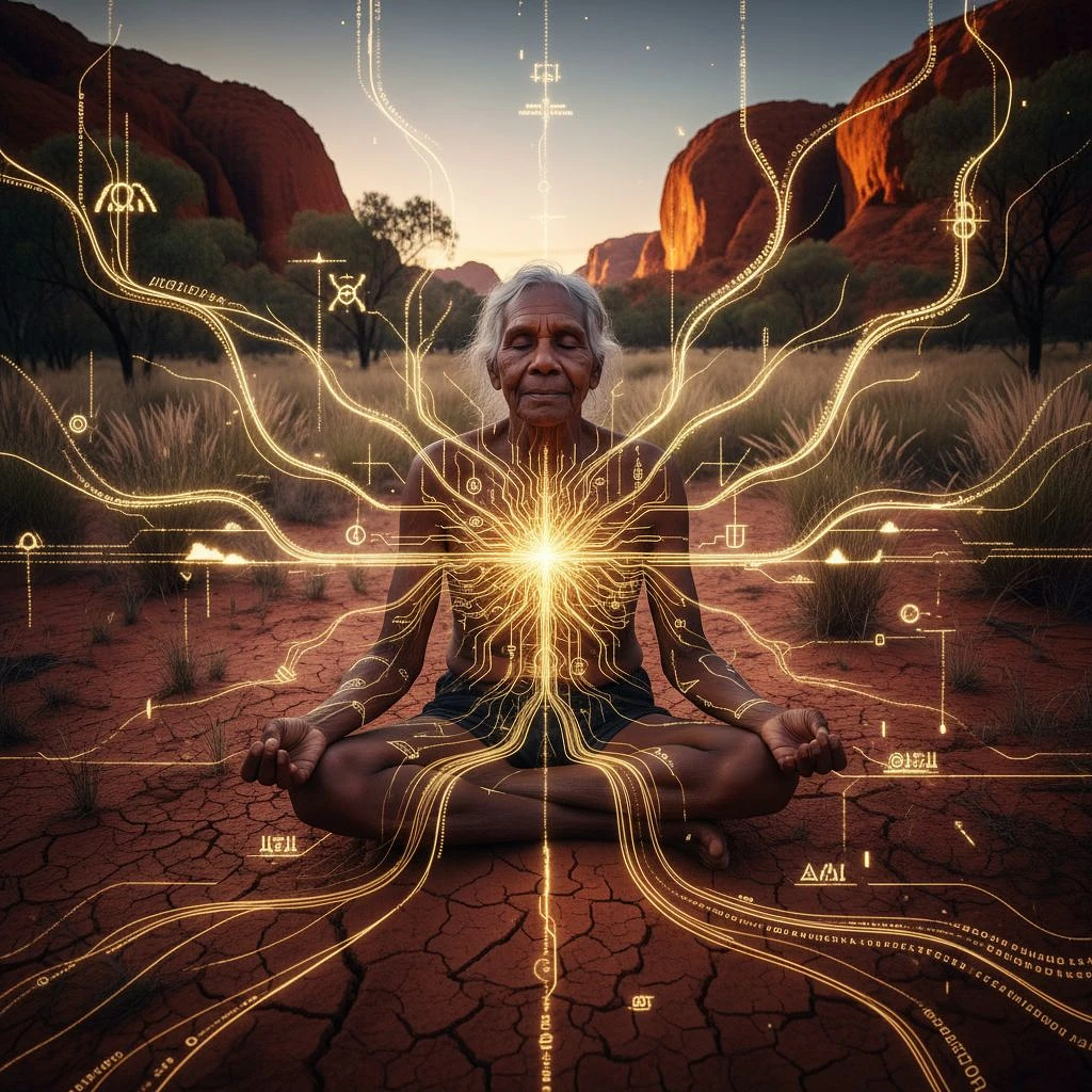 `A powerful Aboriginal Elder, face etched with wisdom and kindness, sits in a state of deep meditation. From their spirit radiates a luminous, intricate network of golden energy circuits and ancestral Dreaming patterns, symbolizing the Code of Law and Nature. These circuits connect their body directly to the land. ` `The environment is the Australian outback at dusk: ancient rock formations, red earth, and resilient flora. Superimposed over this reality are glowing, holographic representations of sacred sites, songlines, and legal principles written in a flowing, organic binary code of light. ` `Style: A seamless blend of hyper-realistic photography and sacred abstract art. The lighting is dramatic, with the last rays of the sun blending with the ethereal glow of the energy circuits. Depth of field, incredible detail, 8K, photorealistic. --ar 16:9 --style raw --v 6. 1` **Key Powerful Words:** `Living Law`, `Dreaming Patterns`, `Ancestral Code`, `Songlines of Light`, `Organic Binary`, `Absolute Justice`, `Spiritual Circuits`, `Hyper-realistic Symbolism` --- ### The Cinematic Prompt (For Video Generation) : For video, we need to suggest movement, sound, and pacing. This would be the written "brief" for an AI video model. **Prompt:** **Scene:** The vast, red Australian desert at golden hour. The camera slowly orbits around a respected Aboriginal Elder sitting peacefully on the earth. **Action:** As the Elder begins a low, resonant hum (a didgeridoo drone subtly fades in) , faint, golden lines of light—like circuits or neural pathways—begin to glow beneath their skin and spread across the red earth around them. **Visual Effect:** These glowing lines rise into the air, forming a three-dimensional, holographic map of the land. This map is overlayed with pulsating, ancient patterns and symbols (dot art) that intertwine with flowing, data-like streams of light (the "code" of natural law) . **Close-Up:** Extreme close-up on the Elder's eye. Reflected in their eye, we see not just the landscape, but this glowing, interconnected network of law and story. **Ambience:** The sound of wind, distant animal sounds, and a deep, spiritual, electronic-infused musical score that blends traditional instrumentation with modern, resonant synth pads. **Ending:** The camera pulls back, showing the Elder as a calm nexus point of this immense, glowing web of energy that connects the land, the sky, and the cosmos. **Style:** `Cinematic, live-action, hyper-realistic VFX, dramatic lighting, National Geographic meets Denis Villeneuve's 'Arrival' --ar 16:9` --- ### Weaving the Code into the Circuits: You asked to code law and justice into the prompt itself. Notice the word choices above: * **"Code of Law and Nature"**: Directly states the concept. * **"Organic Binary"**: Fuses the digital ("binary") with the natural ("organic") . * **"Songlines of Light"**: Re-imagines the ancient concept of Songlines (paths of law and story across the land) as pathways of data and energy. * **"Spiritual Circuits"**: The key term that defines the glowing energy not as technology, but as the visible manifestation of spirit and law. * **"Ancestral Code"**: Positions the law as both ancient and precise, like a perfect, inherited code. This approach doesn't just depict an Elder; it visualizes their deep, immutable connection to the truth of the country. It shows that their authority comes from being a living part of an ancient, just, and beautiful system. Acknowledgement / signature: JDHampton + AI | Creative Alliance
