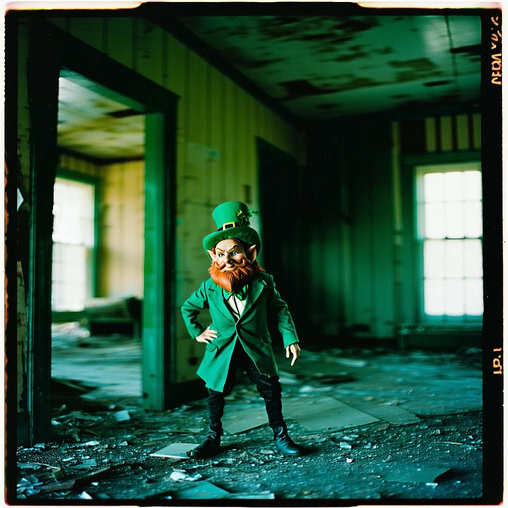 grainy 80's photograph quality polaroid of a leprechaun caught in an abandoned house, dark, uncanny