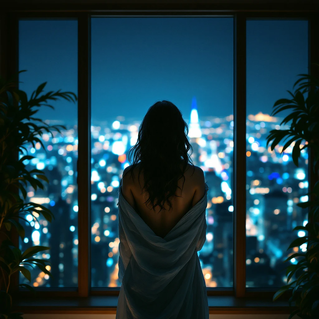 Nighttime cinematic scene of a woman standing in front of a large floor-to-ceiling window overlooking a vast, vibrant cityscape glowing with bokeh lights. The woman has dark, wavy hair cascading naturally down her back, partially draped in a soft, flowing fabric that reveals her bare back. The room is warmly lit with soft, moody tones, surrounded by lush green houseplants on either side of the window. The wooden window frame and warm interior contrast beautifully with the cool blue and white lights of the sprawling city outside. The scene exudes an intimate, contemplative mood with a nostalgic film grain texture, inspired by high-end analog photography.